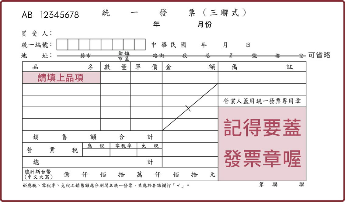 金額:銷售額(未稅)、營業稅金額、總計(含稅金額);二聯式不區分出營業稅額。